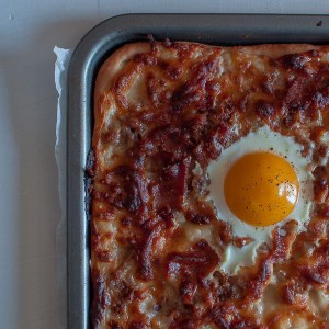 Pop the pizza in the oven and keep and eye on it.  Once the sauce is bubbling and cheese is starting to turn golden remove the pizza from the oven.  Using the back of a spoon, make two little wells in the pizza toppings and break an egg into each.  Add a little pinch of salt and a grind of pepper to the yolk of each egg and return to the oven.  Your pizza is ready to go when the white is cooked and the yolk still has a bit of wobble.