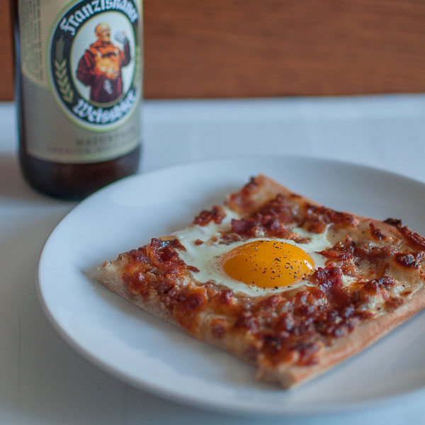 This pizza has beer in it, and two kinds of pork.  Eat it while building a bookshelf or watching the sportsball.